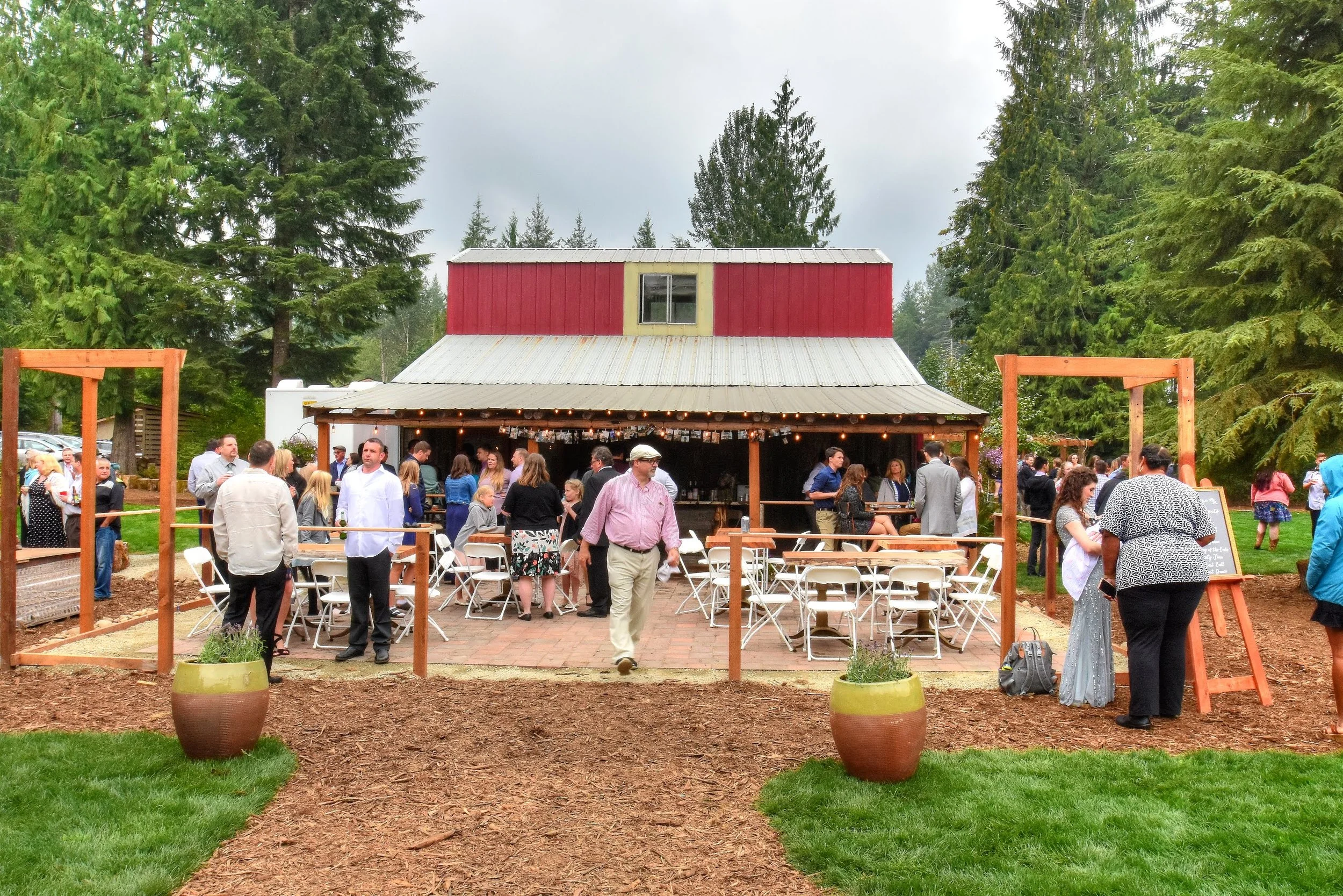 This beautiful grove of fir, cedar, and maple trees is the perfect backdrop for your wedding ceremony, community gathering place, or peaceful reflection space. Featuring an ancient stump and willow wood arch as its centerpiece. There are built in wooden benches that can sit up to 130 guests. Additional rows of folding chairs may be added for larger gatherings.